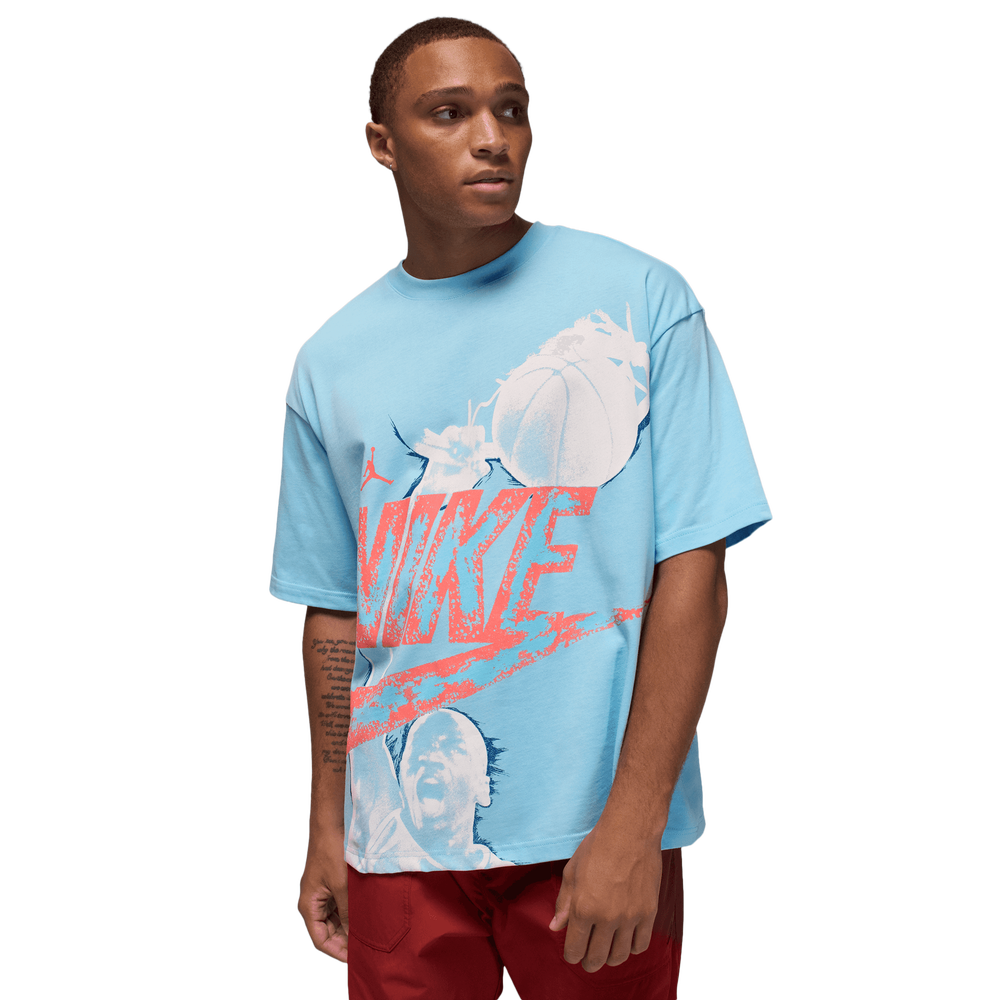 Construction centers on a classic crew collar with clean binding and short sleeves designed for the oversized fit without excess fabric at the cuffs. Jordan Brand's reissue line typically employs quality cotton-based constructions that balance durability with breathability—appropriate for both cooler layering scenarios and warmer seasonal wear. The oversized proportions are proportioned across the chest and body length rather than inflated throughout, a design decision that prevents the piece from reading as shapeless while maintaining the intended relaxed drape that defines contemporary streetwear.